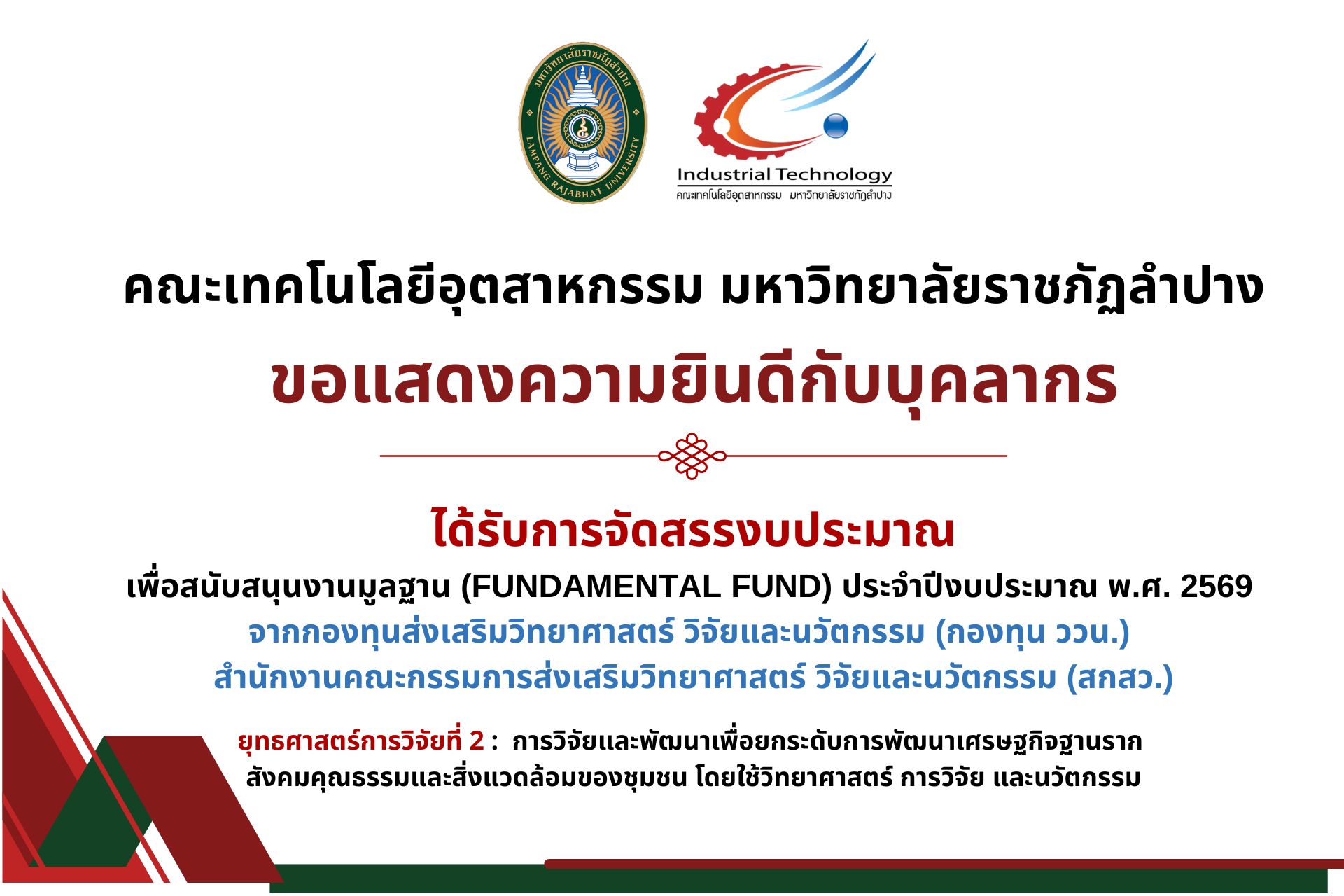 เพื่อสนับสนุนงานมูลฐาน (Fundamental Fund) ประจำปีงบประมาณ พ.ศ. 2569 จากกองทุนส่งเสริมวิทยาศาสตร์ วิจัยและนวัตกรรม (กองทุน ววน.)